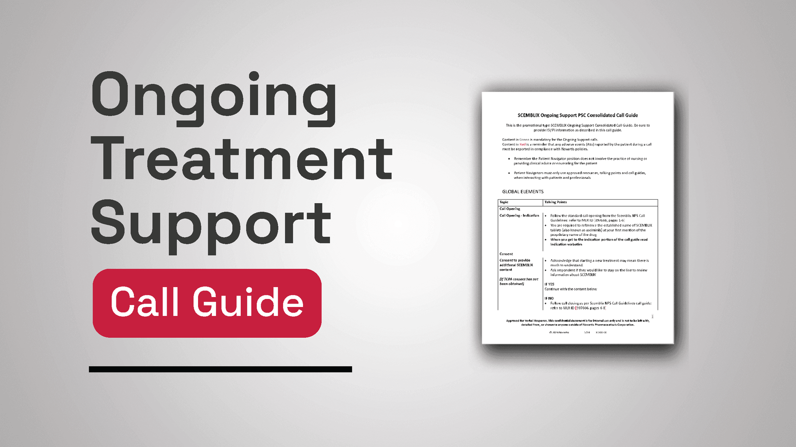 Create an ongoing support call guide for Scemblix that the Care Navigator (CN) at the Novartis Patient Support Center can use as a guide when conducting their cadenced calls with patients/caregivers taking Scemblix that ensures the experience is positive and helpful.